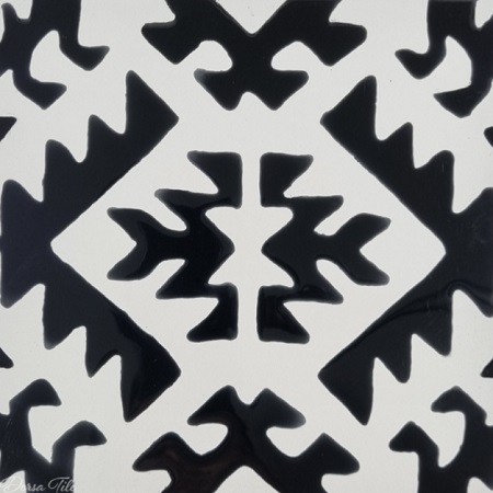 کاشی دست ساز هفت رنگ طرح بختیار با لعاب براق و در رنگ سفید مشکی تولید شده است.