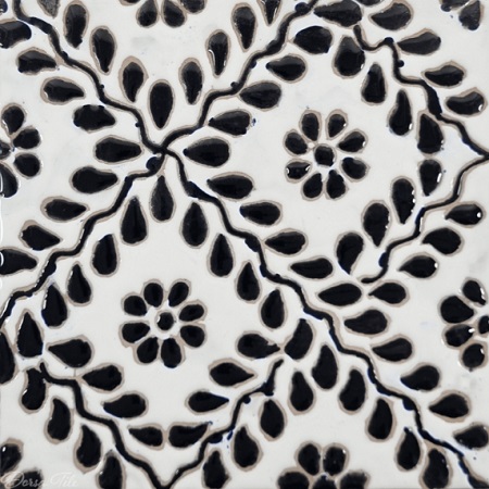 کاشی دست ساز هفت رنگ طرح پری با لعاب براق و در رنگ سفید مشکی تولید شده است.