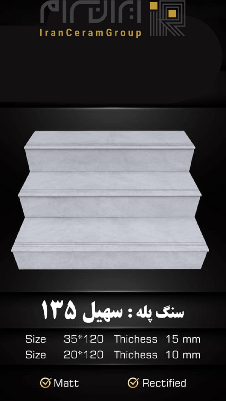 ابعاد این سرامیک 120*35 سانتیمتر بوده و برای استفاده در راه پله، پله، پله داخل و بیرون ساختمان ... بسیار مناسب است.