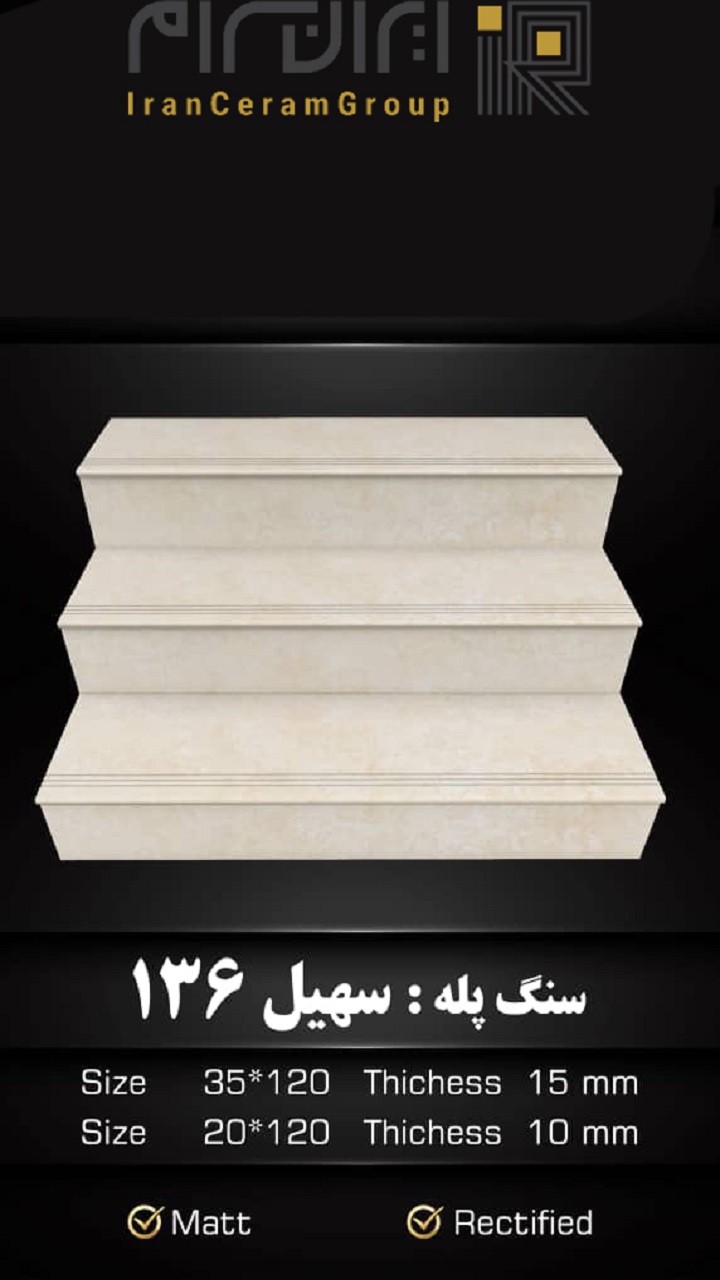ابعاد این سرامیک 120*35 سانتیمتر بوده و برای استفاده در راه پله، پله، پله داخل و بیرون ساختمان ... بسیار مناسب است.